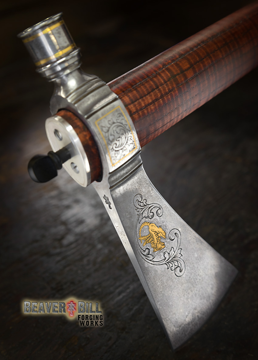 Beaver Bill Exclusive Presentation Pipe Tomahawks are all custom hand made on speculation. They are produced on a very infrequent basis. Keep coming back to check availability. These are collaborative efforts with hand engraving. They are suitable to display or to use. Below are recent samples of Presentation Hawks that have been hand crafted by Beaver Bill.